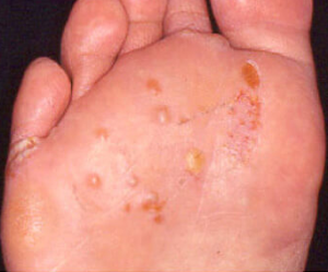 손바닥이나 발바닥에 작은 물집이 많이 생겨 고름이 쌓이고 피부가 빨갛게 변하는 피부질환으로 증상이 나아지거나 나빠지는 것을 반복하며, 가벼운 가려움증이 동반 될 수 있습니다.