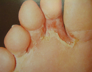발가락 사이에 발병하는 타입으로, 무좀 속에서 가장 흔하게 볼 수 있는 형태입니다. 4번째와 5번째 발가락 사이에 발생하는 경우가 많고, 하얗게 피부가 벗겨지고 붉게 짓무르기도 하여 냄새가 심하게 날 수 있으며, 가려움증을 심하게 느끼는 유형입니다.