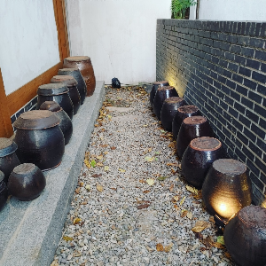 옹기종기 모여있는 항아리들과 은은한 조명이 따뜻하고 편안한 분위기를 연출합니다.