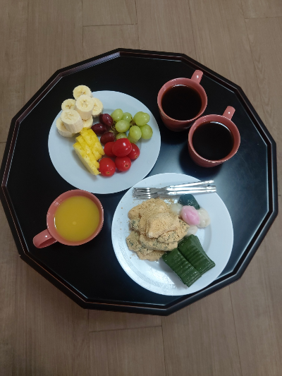 다음날 간단한 조식이 제공되었는데요 떡과 과일, 커피 (오렌지주스는 아이용)이 나오는데 떡도 쫄깃쫄깃 맛있고, 과일은 무척 신선했습니다.